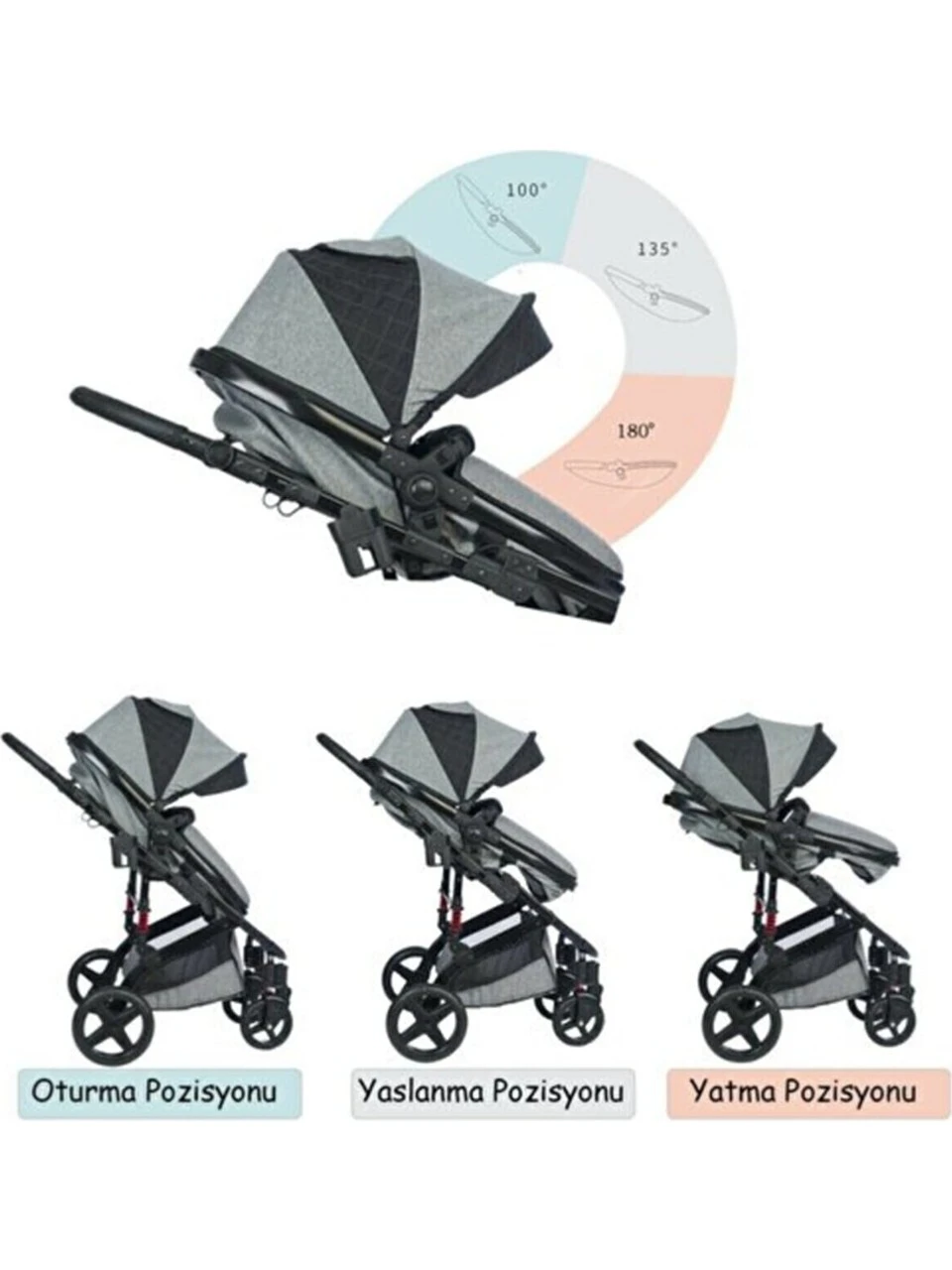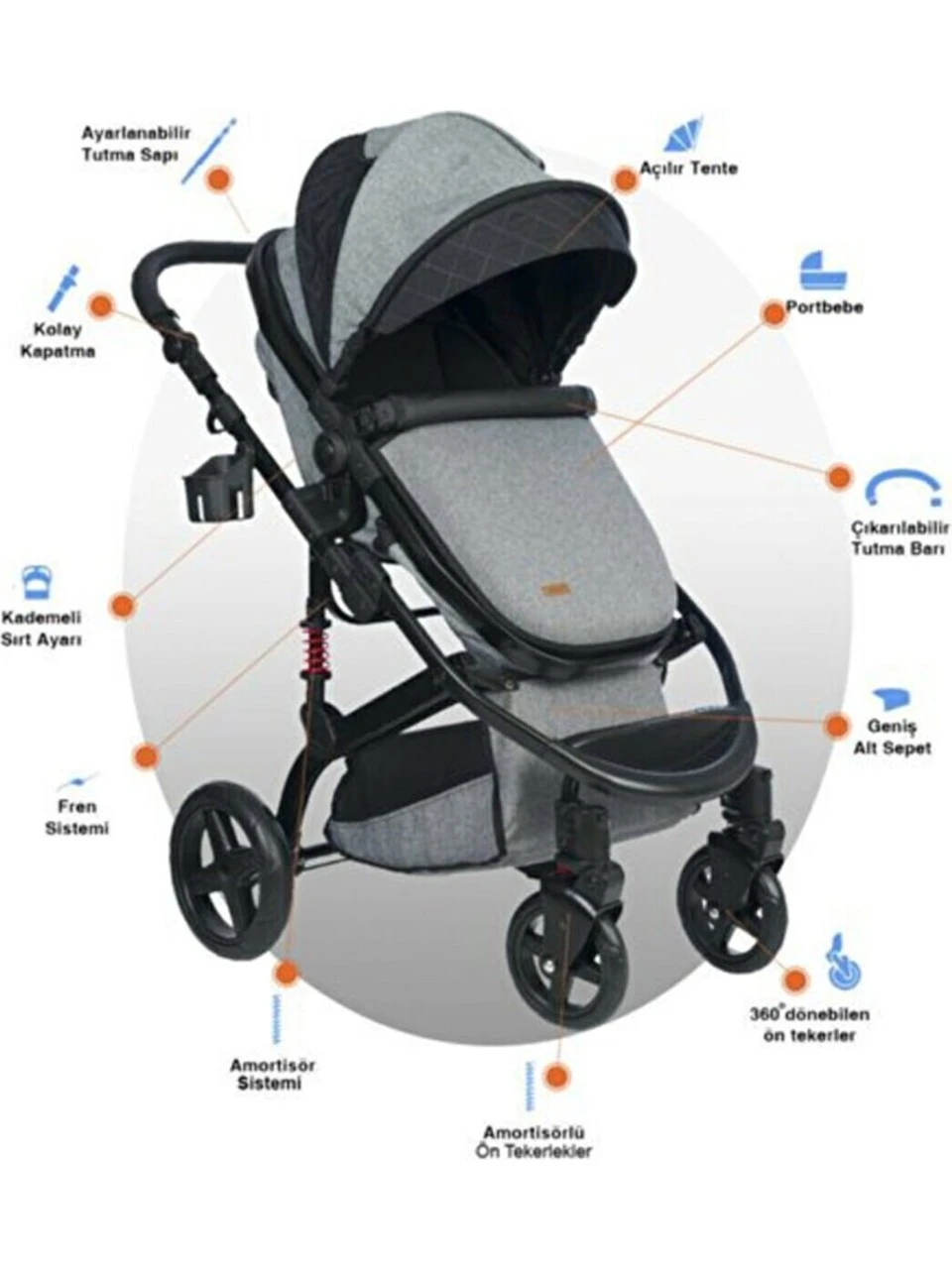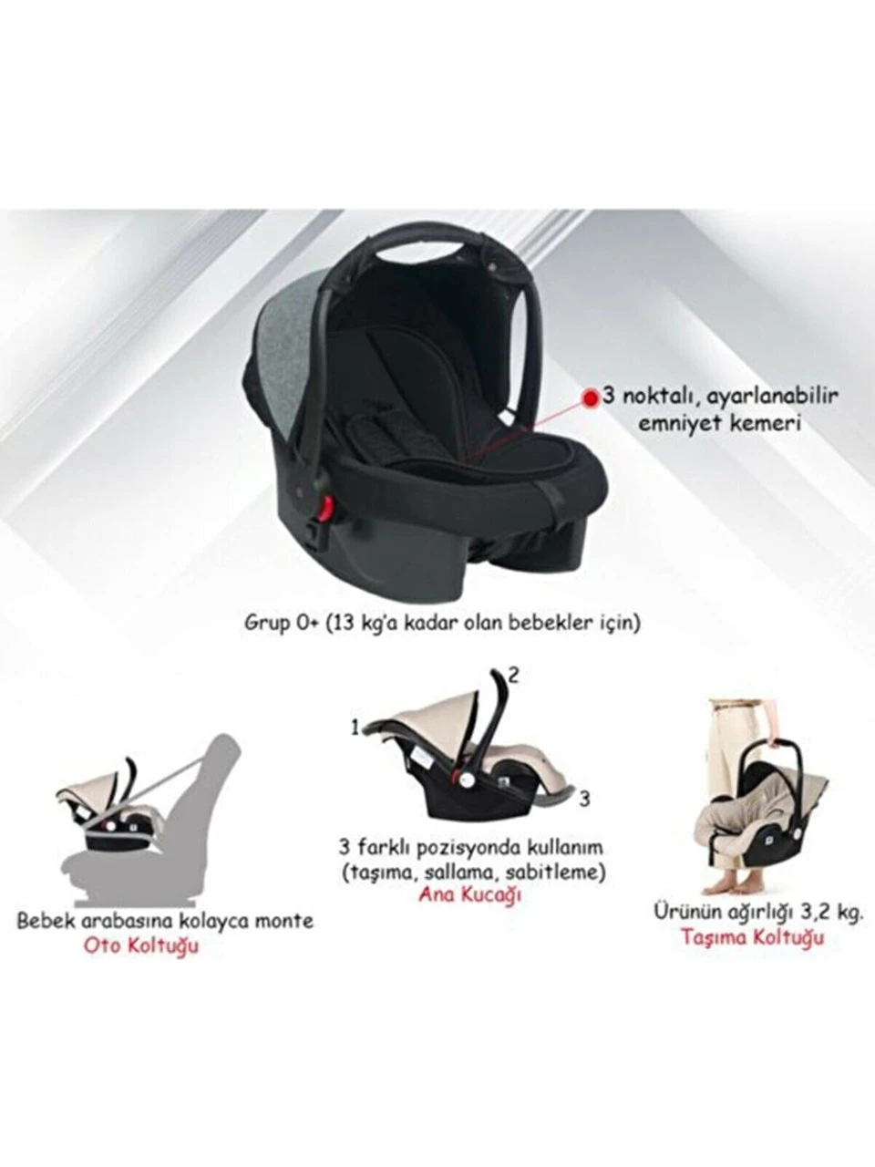 - 3’ü 1 Arada: Bebek taşıyıcı + oto koltuğu + bebek arabası