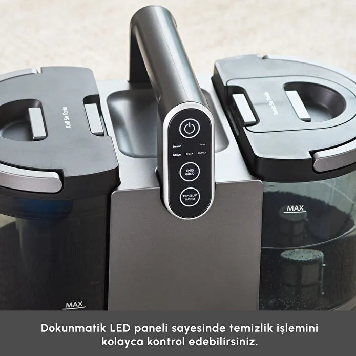 Kullanım kolaylığını artıran özellikler arasında, temizlik modlarının ve emiş gücünün ayarlanabildiği Dokunmatik LED Panel yer alır. 1.6 L temiz su tankı, sık sık su doldurma ihtiyacını ortadan kaldırırken, 0.95 L kirli su tankı toplanan kirin kolayca boşaltılmasına olanak tanır. Ayrıca, Kendi Kendini Temizleme Aparatı sayesinde makinenin hortum ve iç sistemi hijyenik kalır.